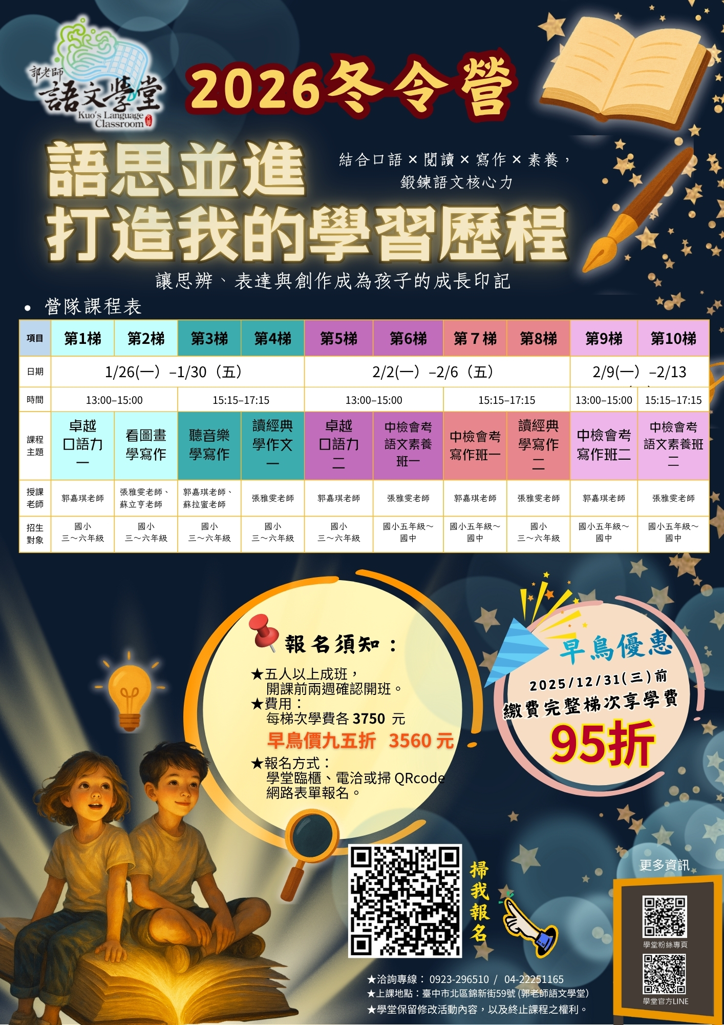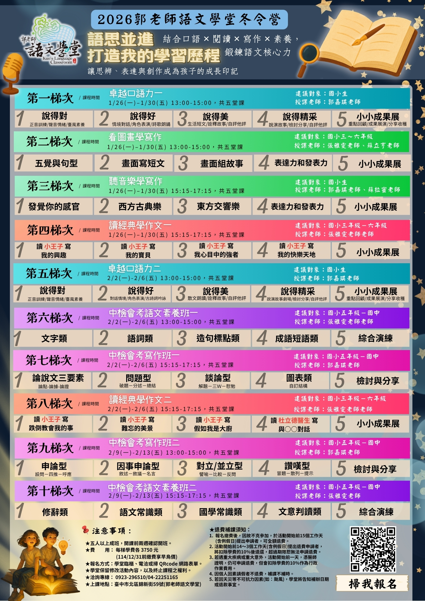郭老師語文學堂 2026 冬令營課程強勢登場!課程結合語文表達、閱讀理解、寫作創意與語文素養